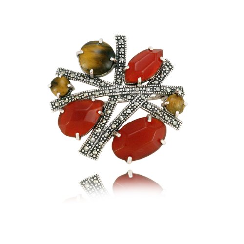 Sterling Silver Marcasite, Carnelian and Tiger's Eye Geometric Pin