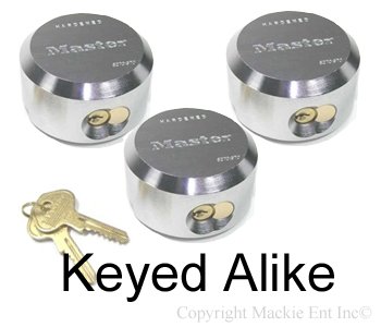The extra heavy duty 2-7/8" wide padlocks are ideal for all outdoor applications when needing multiple locks that utilize ONLY one key. The same key opens all locks. Each lock comes with two keys, therefore you will receive a total of six keys with the purchase of this 3 pack. You can order up to eight locks keyed alike. This style lock is also available in a 2-pack and a 3-pack. To purchase visit our Amazon Store (click on our logo), or via the Master Lock link under this pages title. To reach any desired quantity order a combination of 2-packs, 3-packs, or 4-packs. For quantities greater than eight please inquire, and we can normally have them in a couple of days.