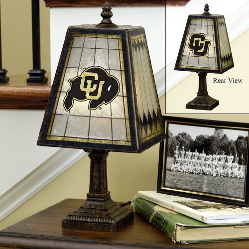 The University of Colorado Art Glass Table Lamp measures approximately 14 inches high and is constructed of high quality materials. The lamp features a glass shade with the universities team logo and colors. The University of Colorado Art Glass Table Lamp is the perfect accent to any dorm room or for your home office.